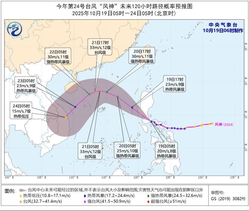 r中央时局台10月19日6时发布台风蓝色预警:本年第24号台风“风神”(热带风暴级)昨天傍晚在菲律宾吕宋岛东南沿海登陆(18米/秒,998百帕),今天(19日)清早5点钟其中心位于菲律宾吕宋岛上,中心隔壁最大风力有8级(20米/秒),中心最低气压为995百帕,七级风圈半径150-180公里。